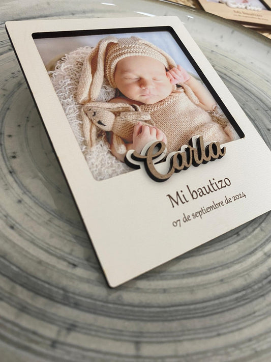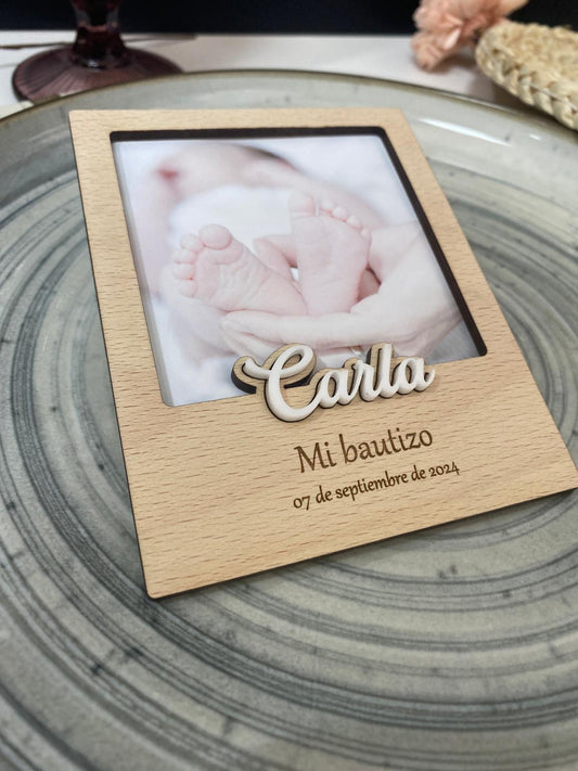 Porta fotos polaroid bautizo madera