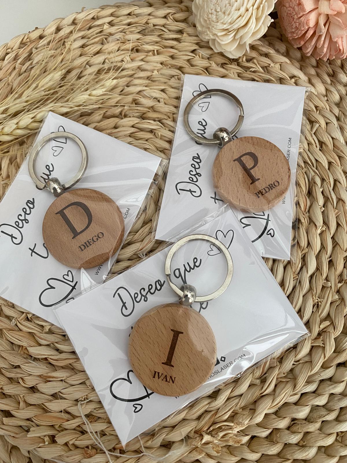 Llavero marcasitio con forma circular con inicial y nombre. Un regalo ideal para tus invitados.