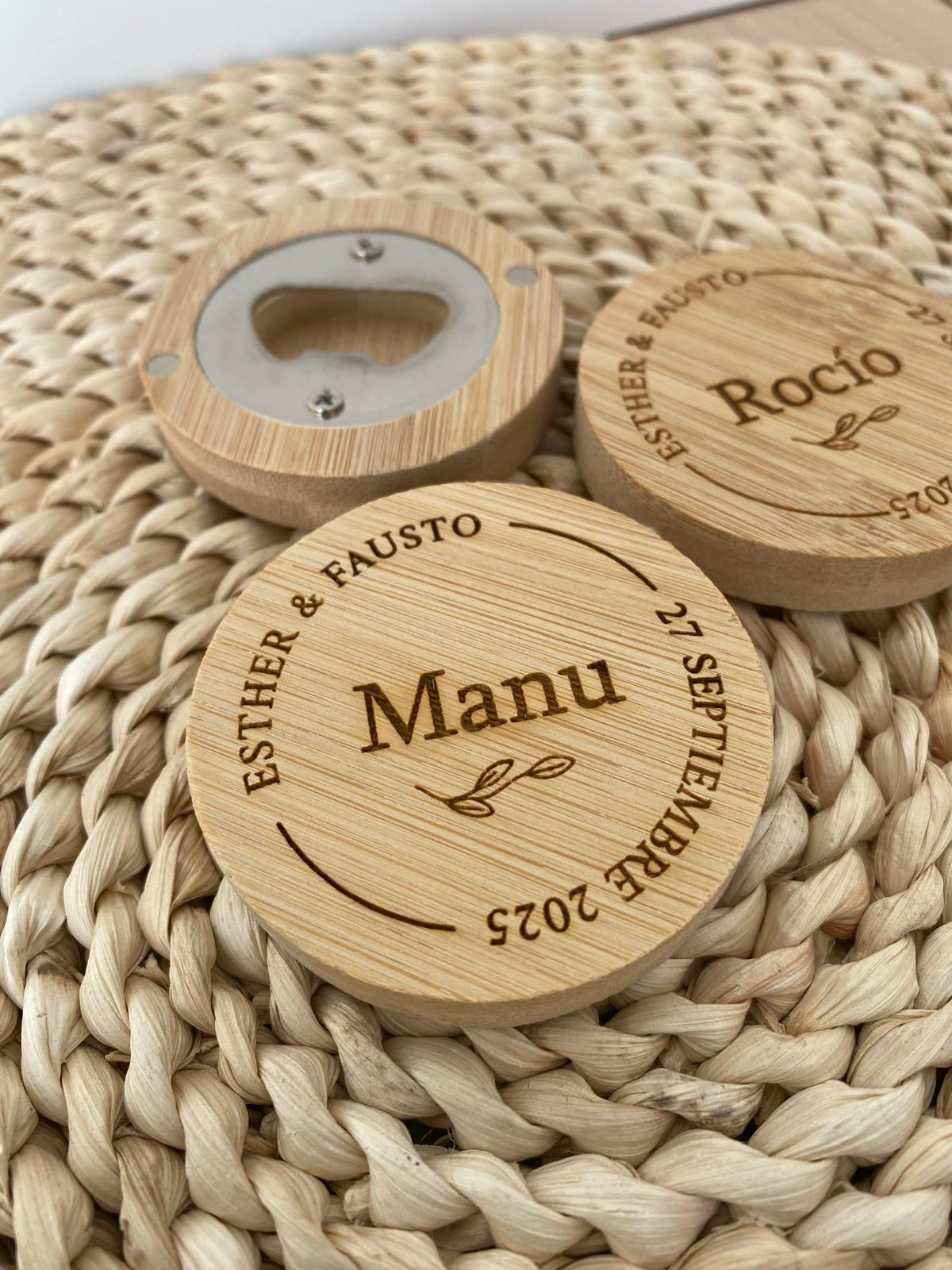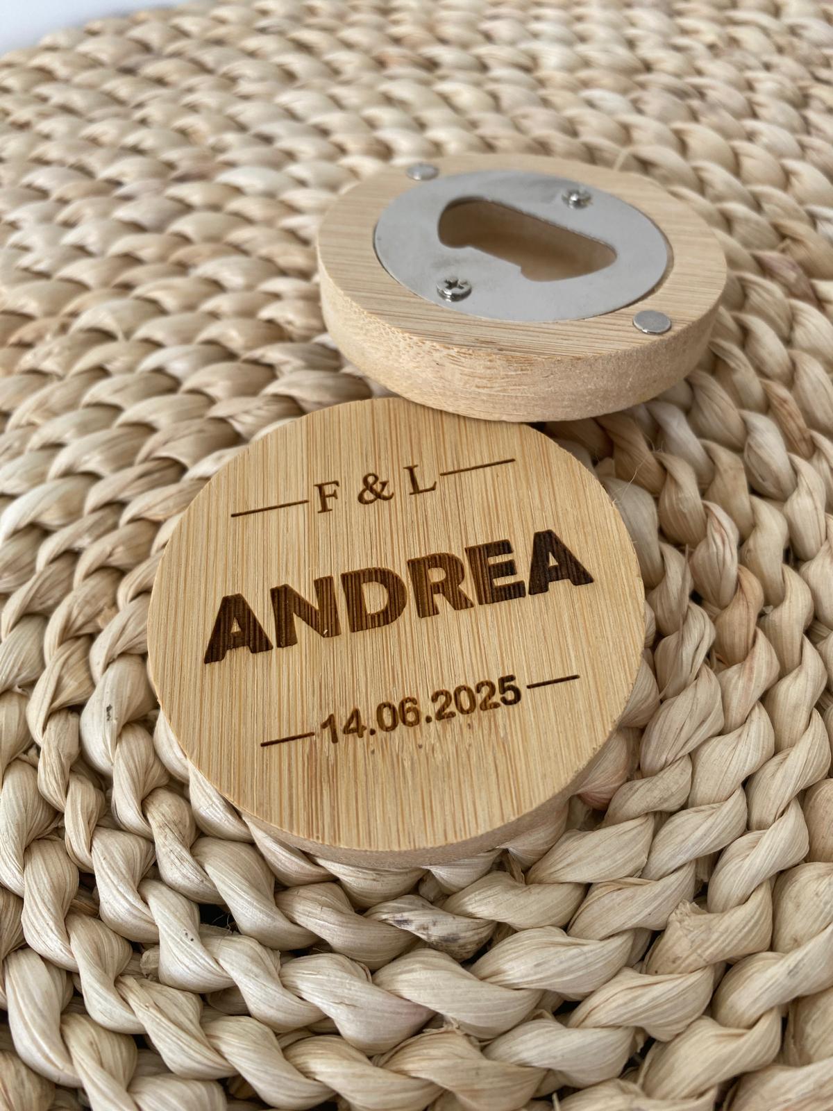 Marcasitio modelo abridor con imán, personalizable con el nombre de cada invitado.
